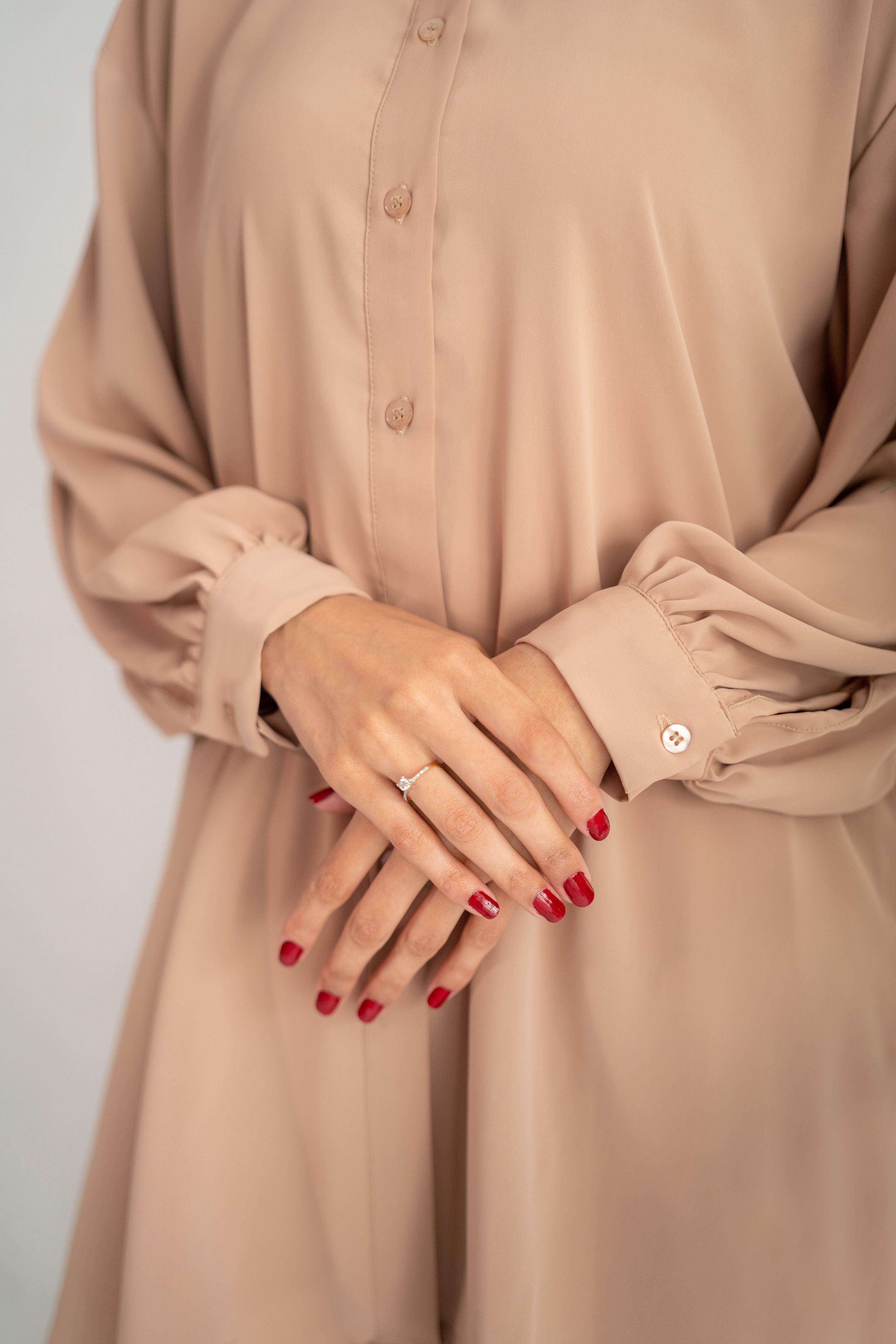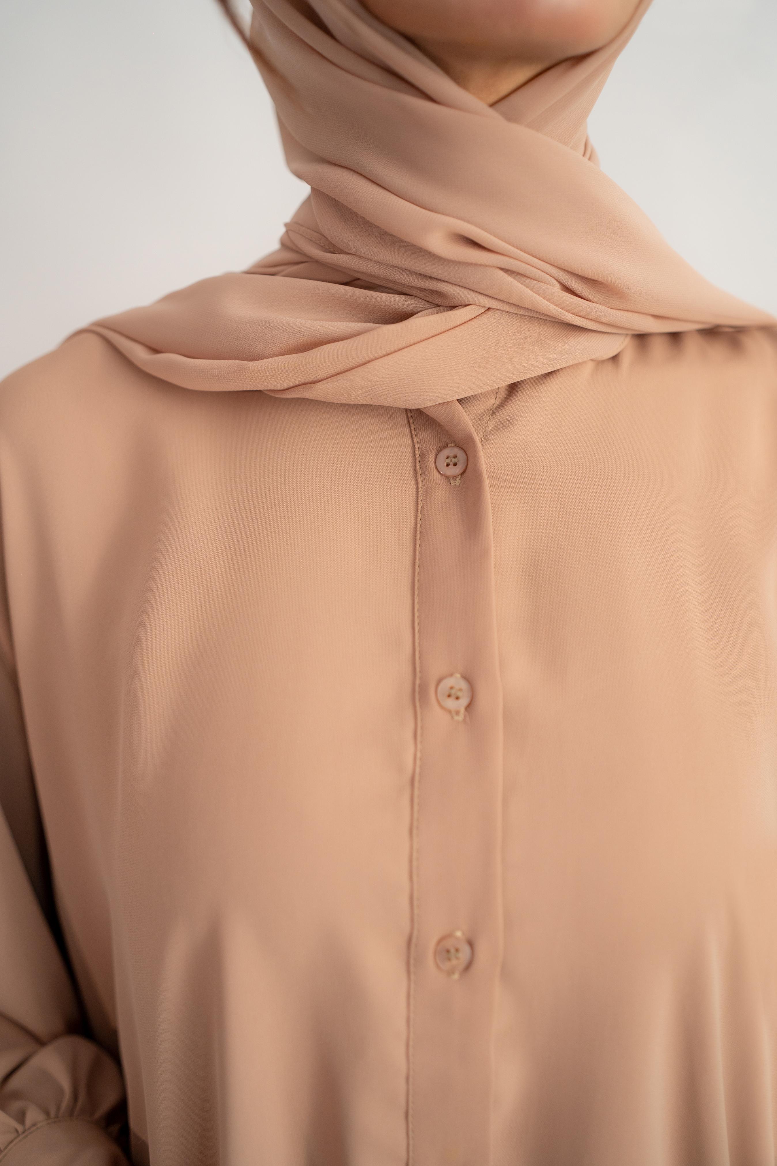 This modest wear set combines elegance and comfort in a contemporary silhouette. The beige oversized shirt with button-down detailing and the wide-leg pants are made from soft Korean nada, providing both style and ease of movement. Paired with a lightweight chiffon georgette scarf.