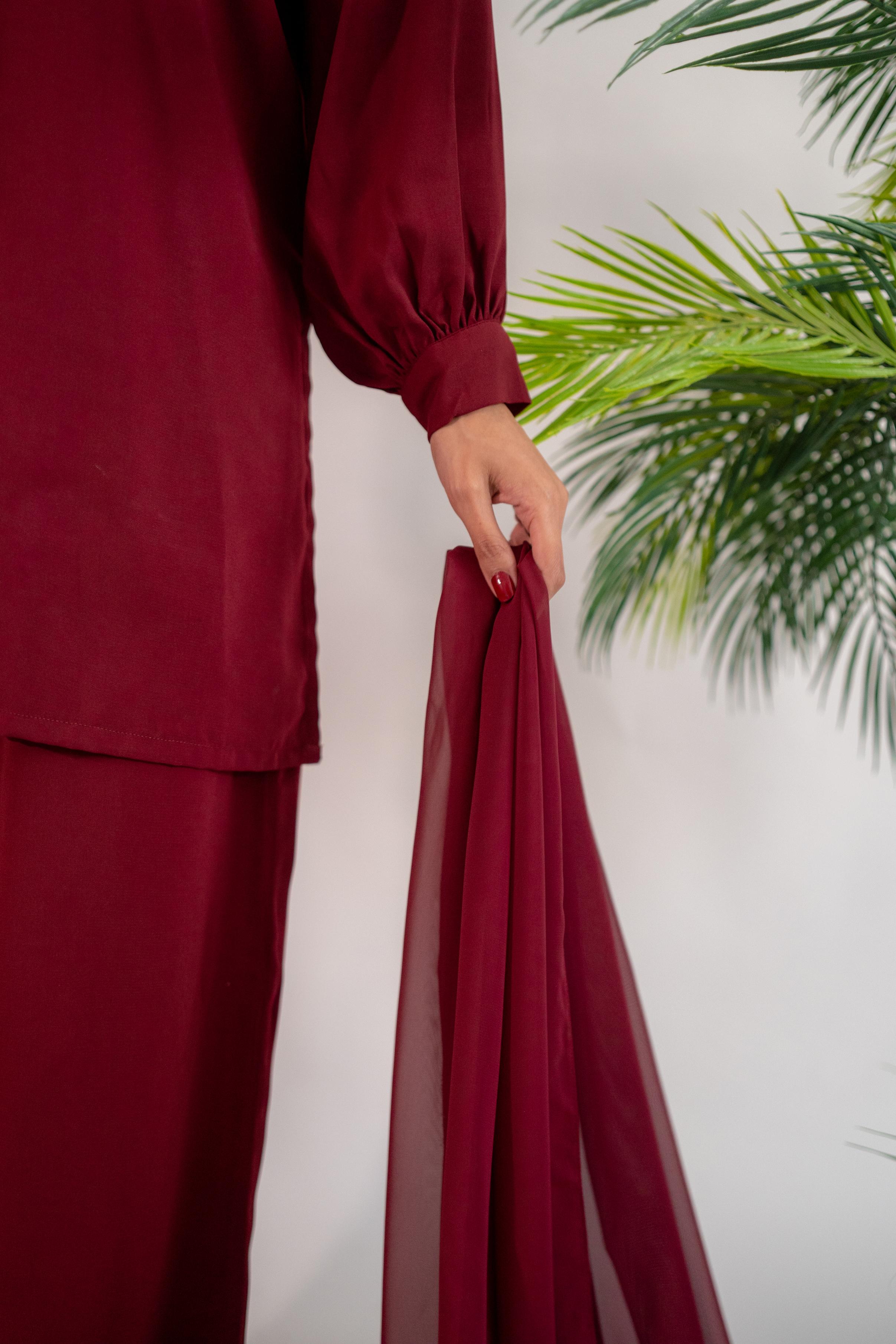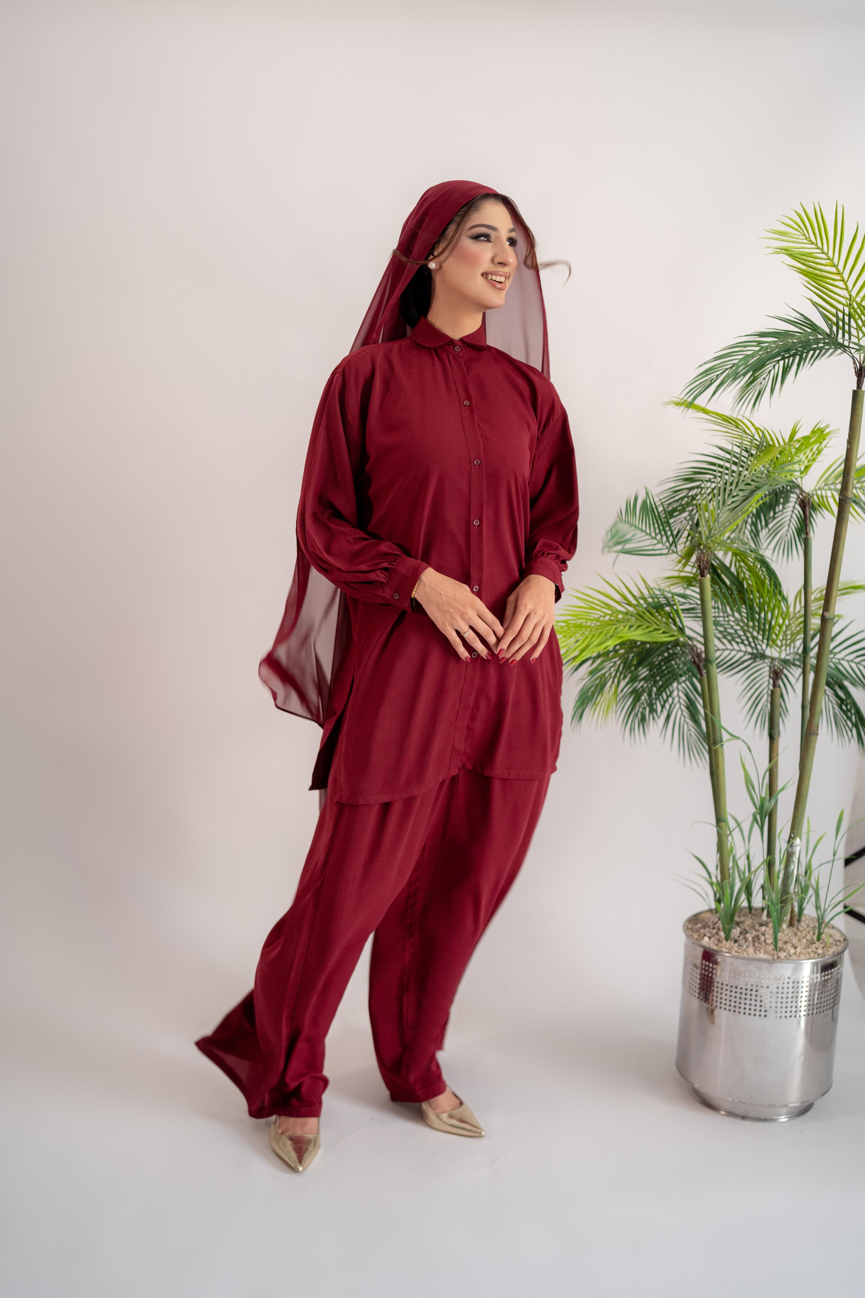 This modest wear set combines elegance and comfort in a contemporary silhouette. The Maroon oversized shirt with button-down detailing and the wide-leg pants are made from soft Korean crepe, providing both style and ease of movement. Paired with a lightweight chiffon georgette scarf.